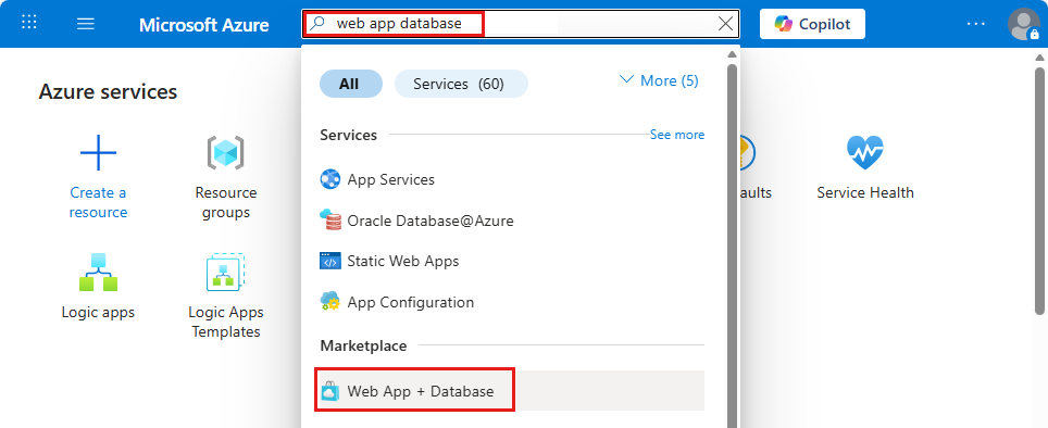 2. Under the Marketplace heading, select the item labeled Web App + Database. You can also navigate to Create Web app directly.