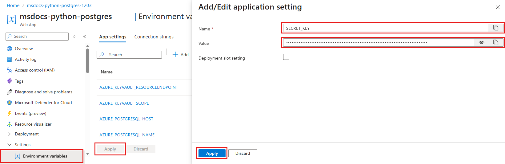 1. In the left menu of the App Service page, select Settings > Environment variables.