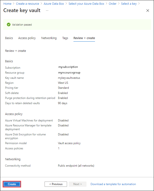 Review the information for your key vault, and select Create. Wait for a couple minutes for key vault creation to complete.