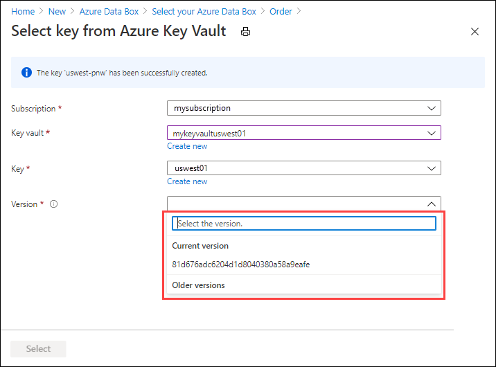 12. Select the Version of the key to use, and then choose Select.