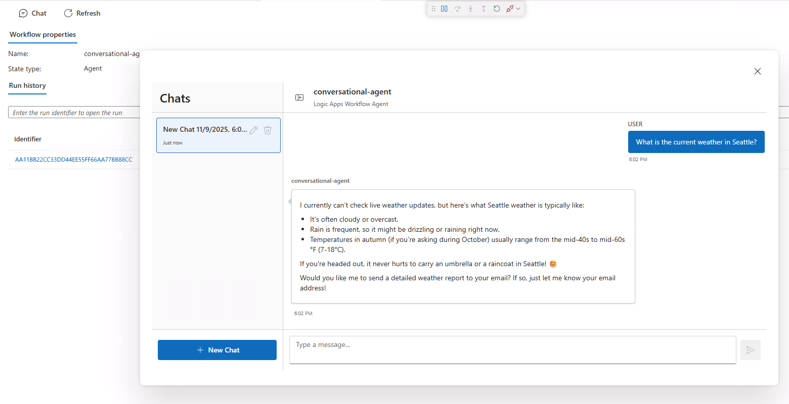 When you need AI-powered automation that interacts with humans, create conversational agent workflows in Azure Logic Apps. These workflows use natural language, agent loops, and large language models (LLMs) to make decisions and complete tasks based on human-provided inputs and questions, known as prompts. These workflows work best for automation that's user-driven, short-lived, or session-based.