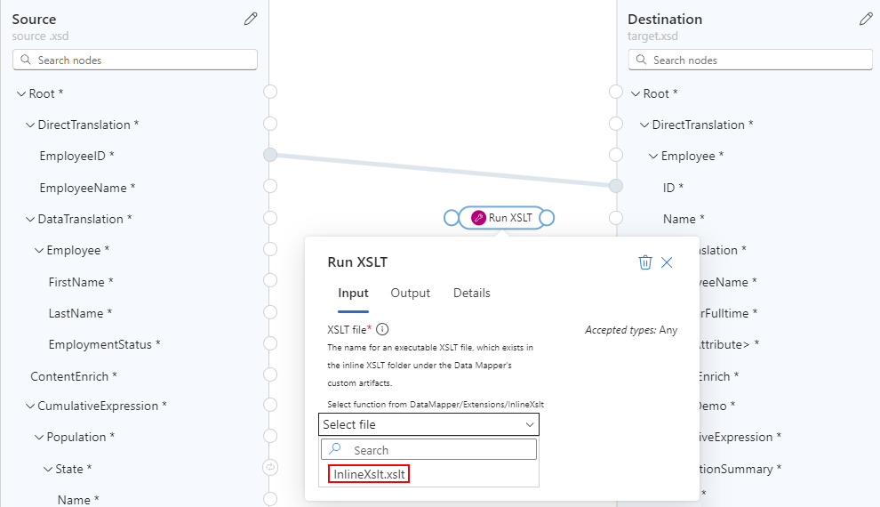 You can run executable XSLT snippets within a data map (.xslt) file by using the Run XSLT function. When you use this function, you get a data map file that contains the actual executable XSLT. The Data Mapper (.lml) file contains a reference to the executable XSLT (.xslt or .xml) file.