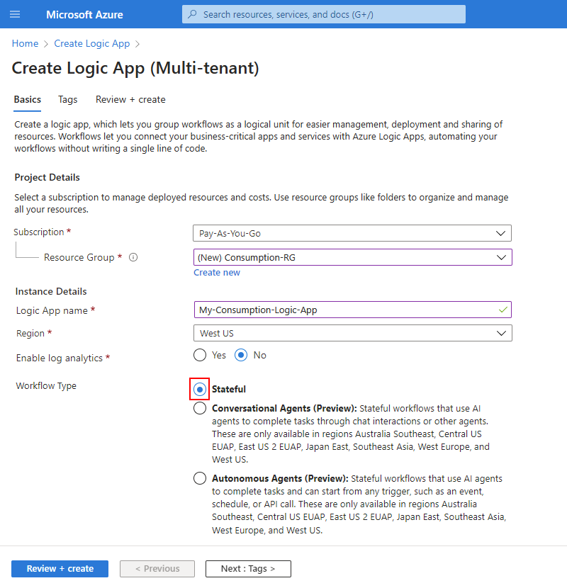This example uses West US.Enable log analytics Yes No Change this option only when you want to enable diagnostic logging. For this quickstart, keep the default selection. Workflow type Yes Stateful The type of workflow to create. All Consumption workflows are stateful, which means the workflow automatically saves and stores run history information, such as status, inputs, and outputs.
