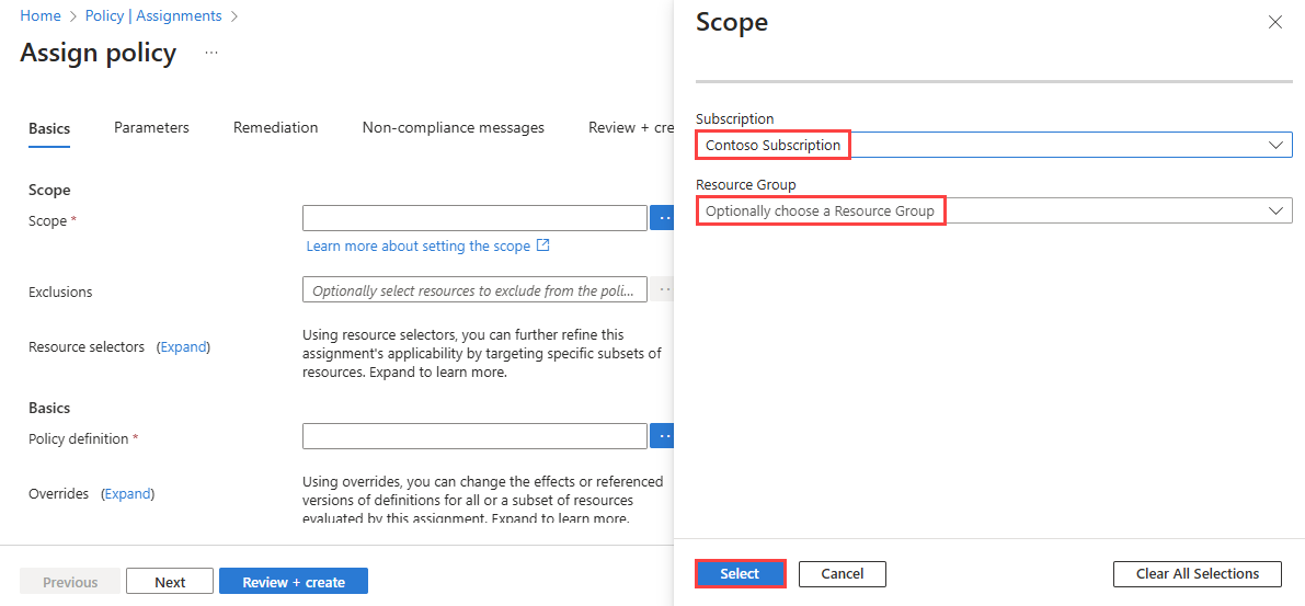 Select the ellipsis (...) next to Scope to choose your Azure subscription that has the virtual networks that you want to check using the policy. You can also choose the resource group that has the virtual networks. After you make your selections, select the Select button.