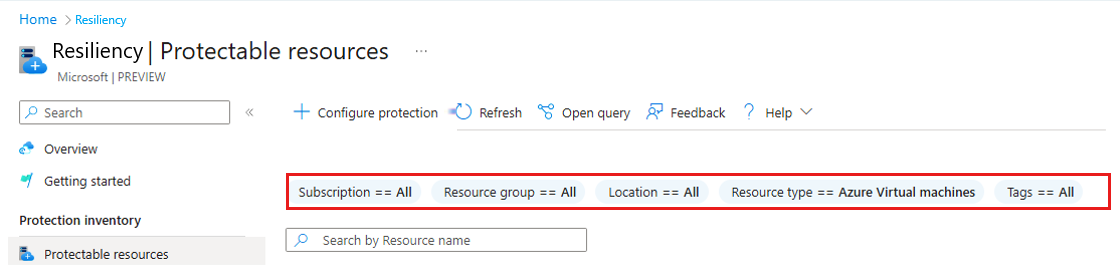 By default, only Azure Virtual machines are shown in the Protectable resources list. You can change the filters to view other resources.