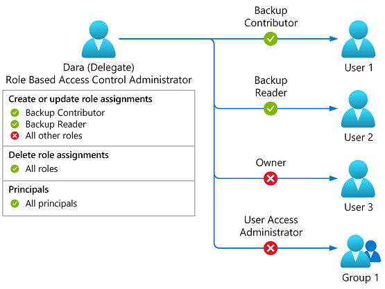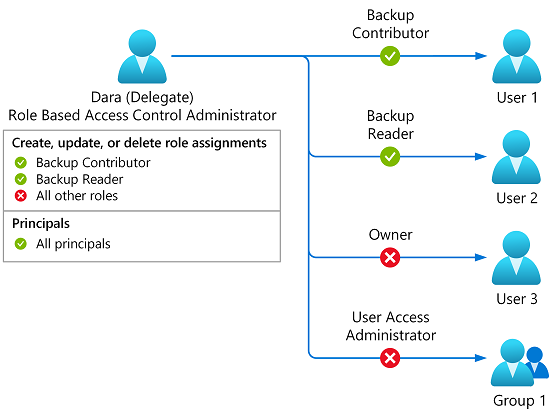 - Alice assigns the Role Based Access Control Administrator role to Dara. Alice adds conditions so that Dara can only assign the Backup Contributor or Backup Reader roles to the Marketing and Sales groups.