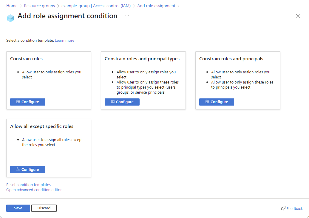 Choose from a list of condition templates. Select Configure to specify the roles, principal types, or principals.