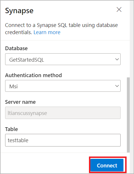- Select the Subscription, Database (dedicated SQL pool name) and Authentication method from the drop-down menu.
