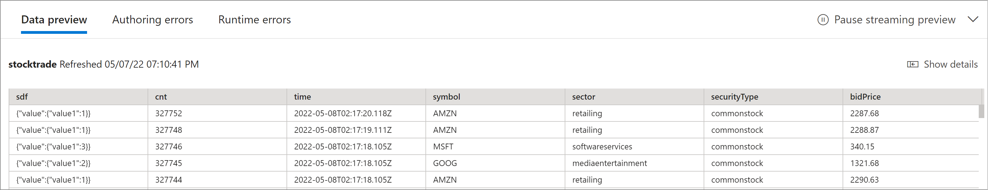 - A live sample of incoming data in the Data preview table under the diagram view. It automatically refreshes periodically. You can select Pause streaming preview to see a static view of the sample input data.