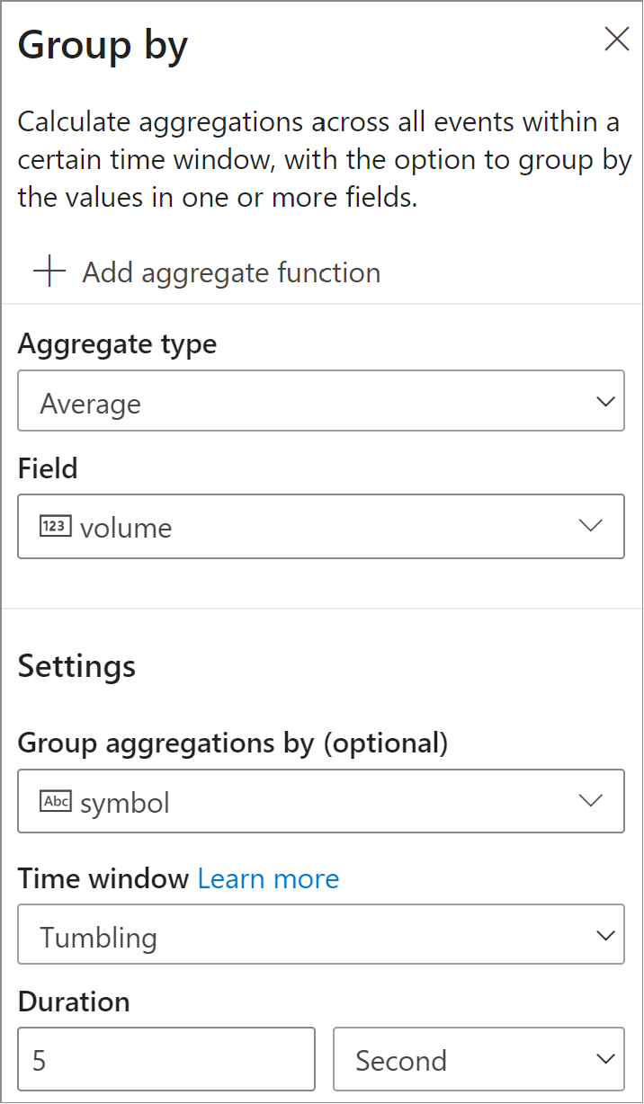 - In the next step, you specify the field and the aggregate you want to calculate, such as Average and Count. You can also specify the field that you want to Group By along with the time window. Then you can validate the results of the step in the Data preview section.