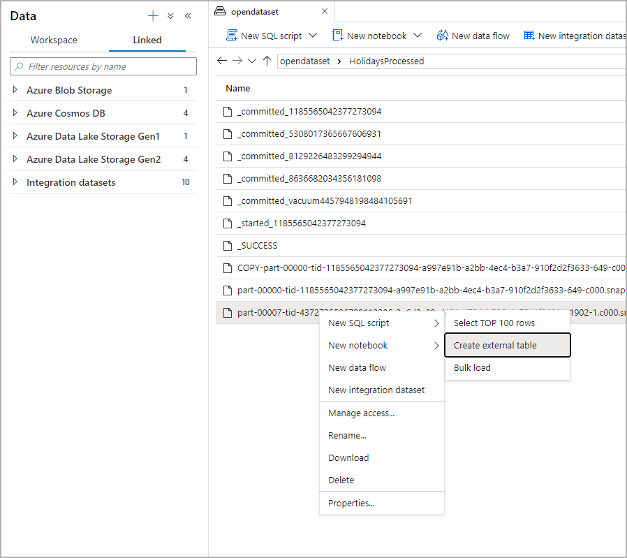Using Data Lake exploration capabilities of Synapse Studio you can now create and query an external table using Synapse SQL pool with a right-click on the file. The one-click gesture to create external tables from the ADLS Gen2 storage account is only supported for Parquet files.