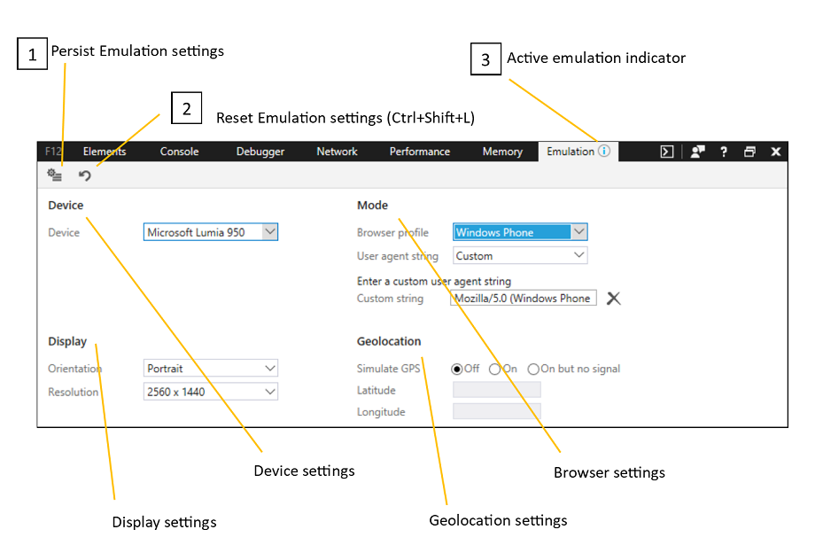 The Reset Emulation settings button resets your emulation settings back to the default Desktop browser profile and Microsoft Edge user agent string with GPS turned off.