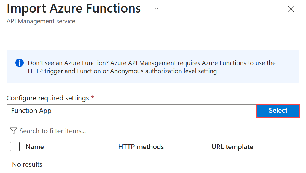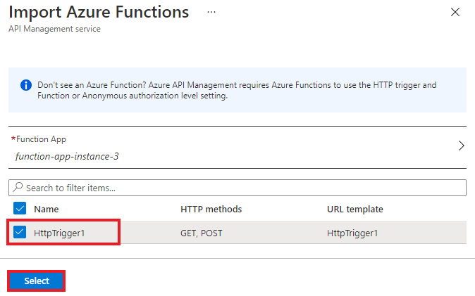 7. Select the functions that you want to import and click Select. You can only import functions that have an HTTP trigger and an Anonymous or Function authorization level.
