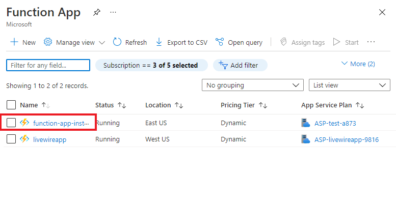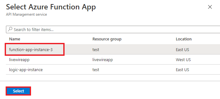 6. Find the function app you want to import functions from, select it, and then click Select:
