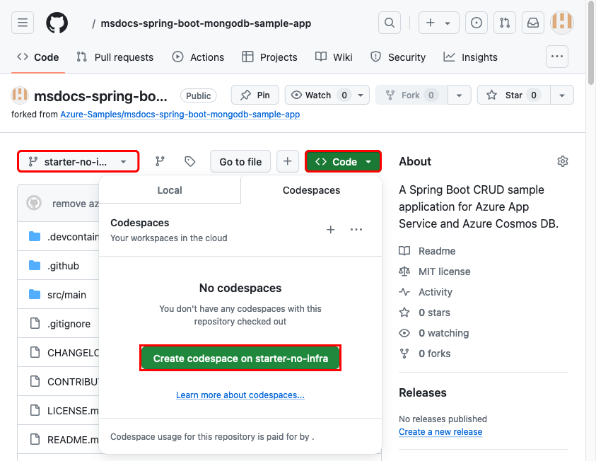 - Navigate to https://github.com/Azure-Samples/msdocs-spring-boot-mongodb-sample-app/fork.