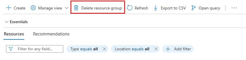 Step 2: In the resource group page, select Delete resource group.
