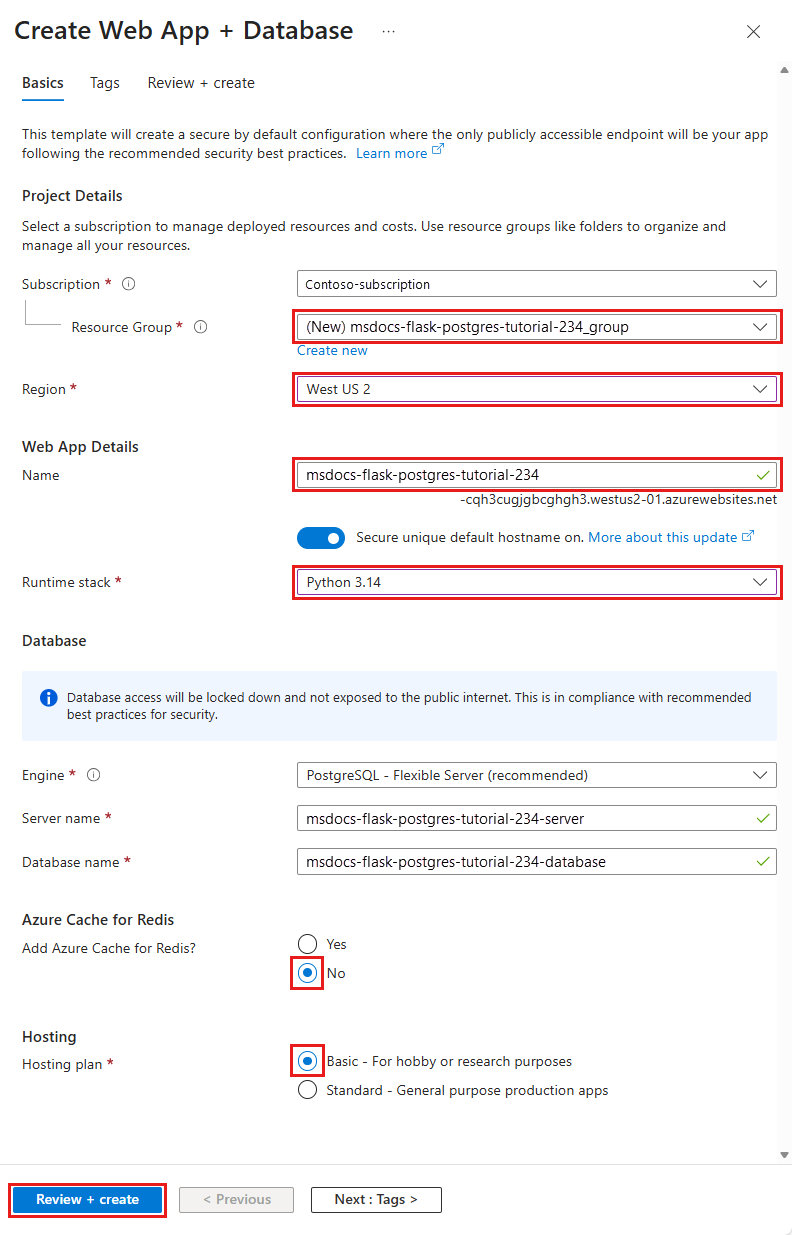 In this section, you create the Azure resources. This tutorial creates a set of secure-by-default resources that include App Service and Azure Database for PostgreSQL. For the creation process, you specify: