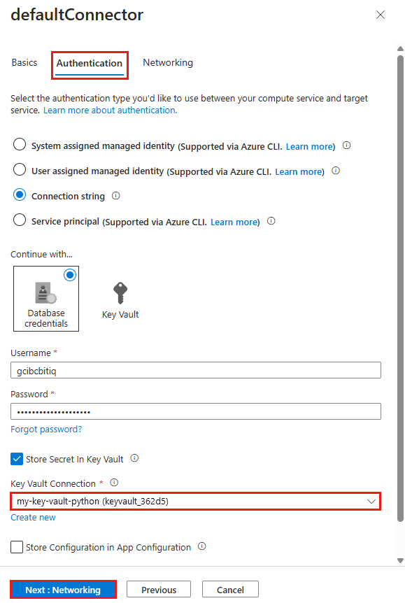 The deployment process generates the connectivity variables for you as app settings. The security best practice is to keep secrets out of App Service completely. Move your secrets to a key vault and change your app setting to Key Vault references with the help of Service Connectors.