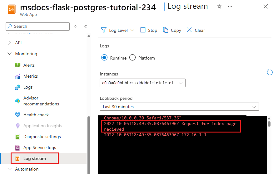 Step 2: From the left menu, select Log stream. You see the logs for your app, including platform logs and logs from inside the container.