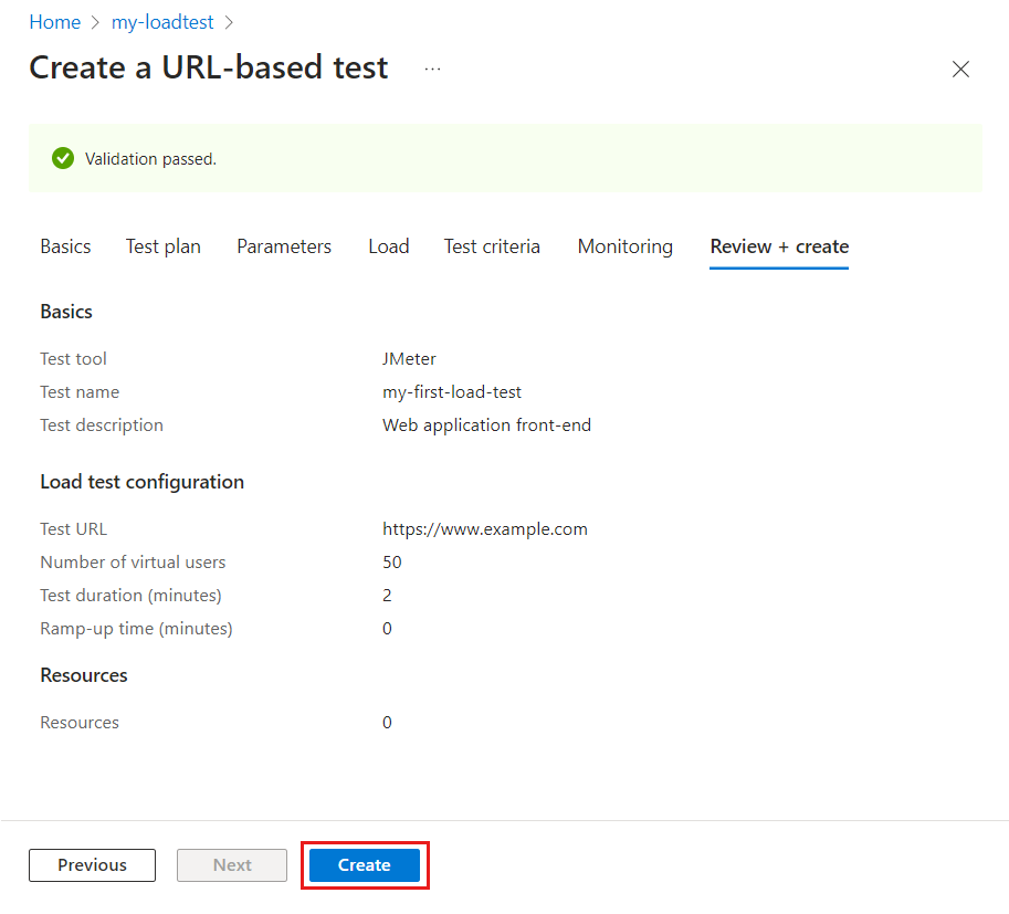 Select Review + create to review the load test configuration, and then select Create to start the load test.