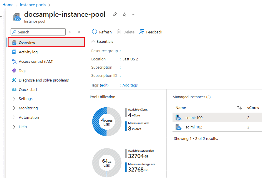 Screenshot of the Overview page of an instance pool in the Azure portal.