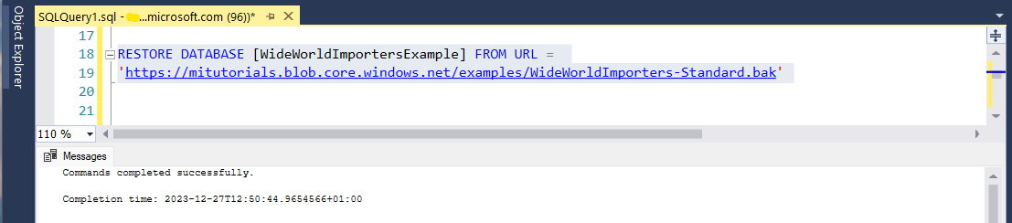 RESTORE DATABASE [WideWorldImportersExample] FROM URL = 'https://mitutorials.blob.core.windows.net/examples/WideWorldImporters-Standard.bak';Tip