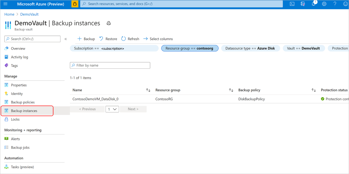 In the DemoVault Backup vault created in the previous step, go to Backup instances and select a backup instance.