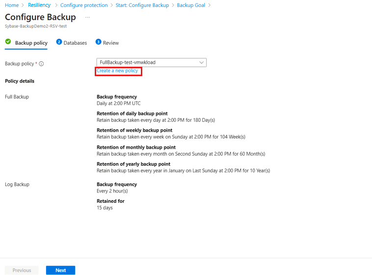 On the Configure Backup pane, on the Backup policy tab, under Backup policy, select Create a new policy for the databases.