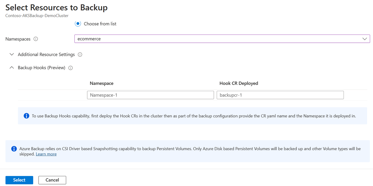 In the Azure portal, go to the AKS cluster that you want to back up.