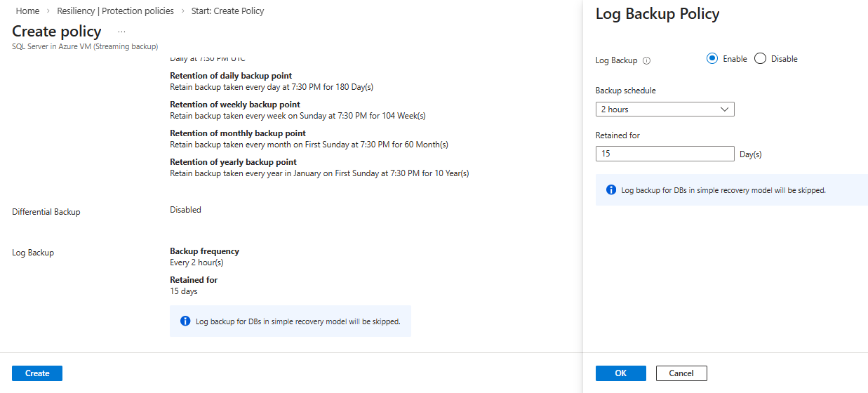 Go to Resiliency, and then select Manage > Protection policies > + Create policy > Create backup policy.