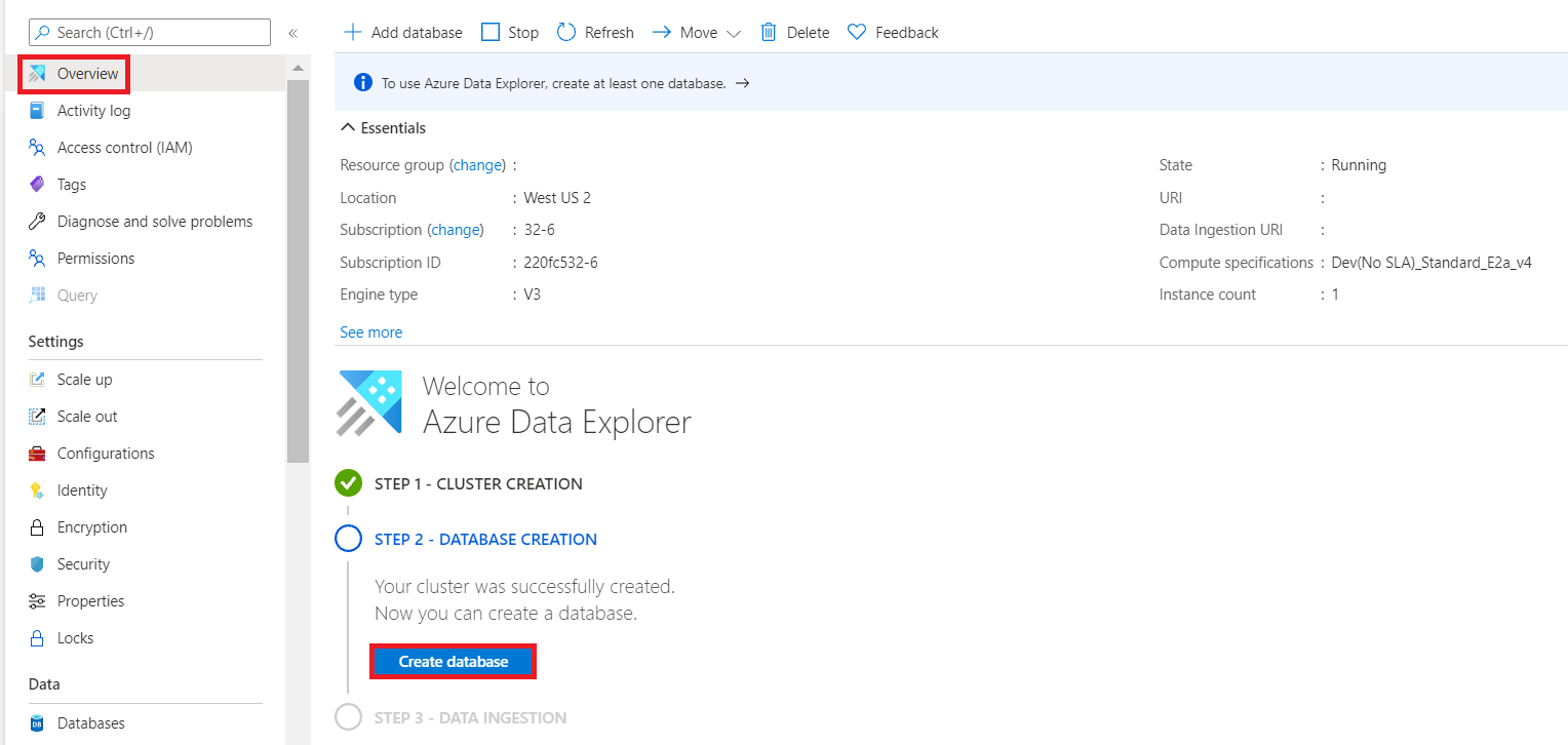 Select Create to create the database. Creation typically takes less than a minute. When the process is complete, you're back on the cluster Overview tab.