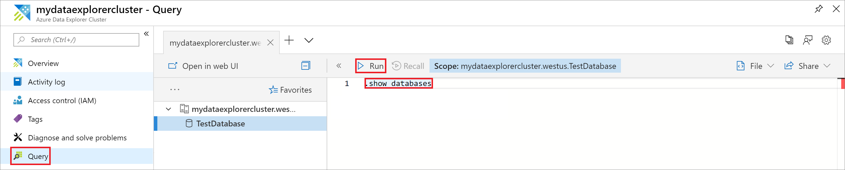 Under your cluster, select Query. Paste the command .show databases into the query window, then select Run.