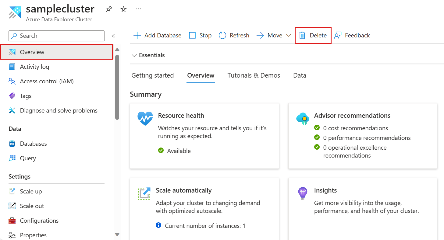 To delete your Azure Data Explorer cluster: