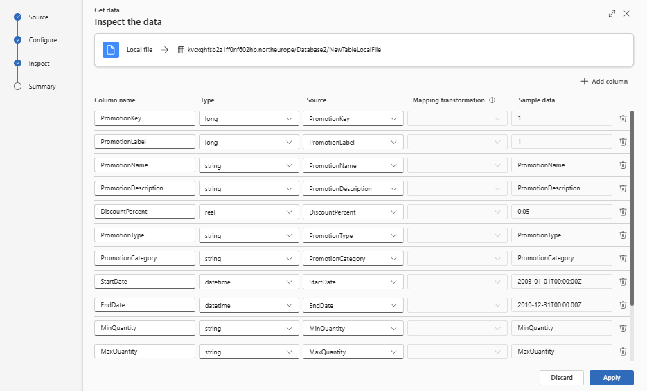 If you're ingesting tabular formats in an existing table, you can select Advanced > Keep current table schema. Tabular data doesn't necessarily include the column names that are used to map source data to the existing columns. When this option is checked, mapping is done by-order, and the table schema remains the same. If this option is unchecked, new columns are created for incoming data, regardless of data structure.