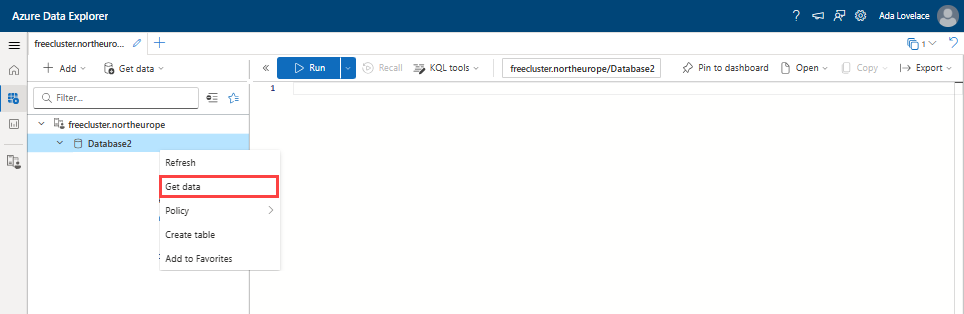 Right-click on the database where you want to ingest the data. Select Get data.