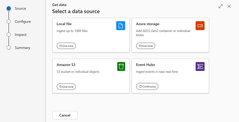 Select the data source from the available list. In this example, you're ingesting data from a Local file.