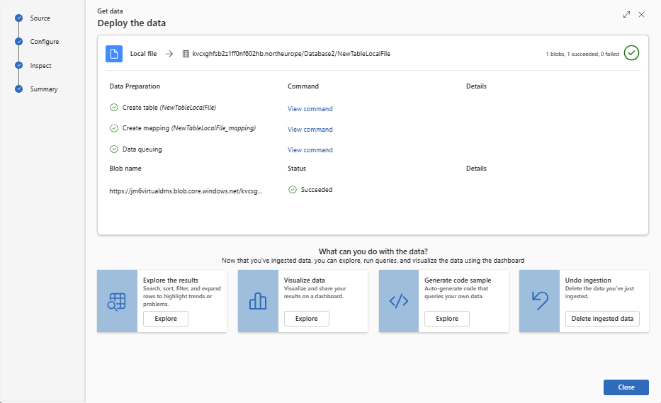 In the Data preparation window, all three steps are marked with green check marks when data ingestion finishes successfully. You can view the commands that were used for each step, or select a card to query, visualize, or drop the ingested data.