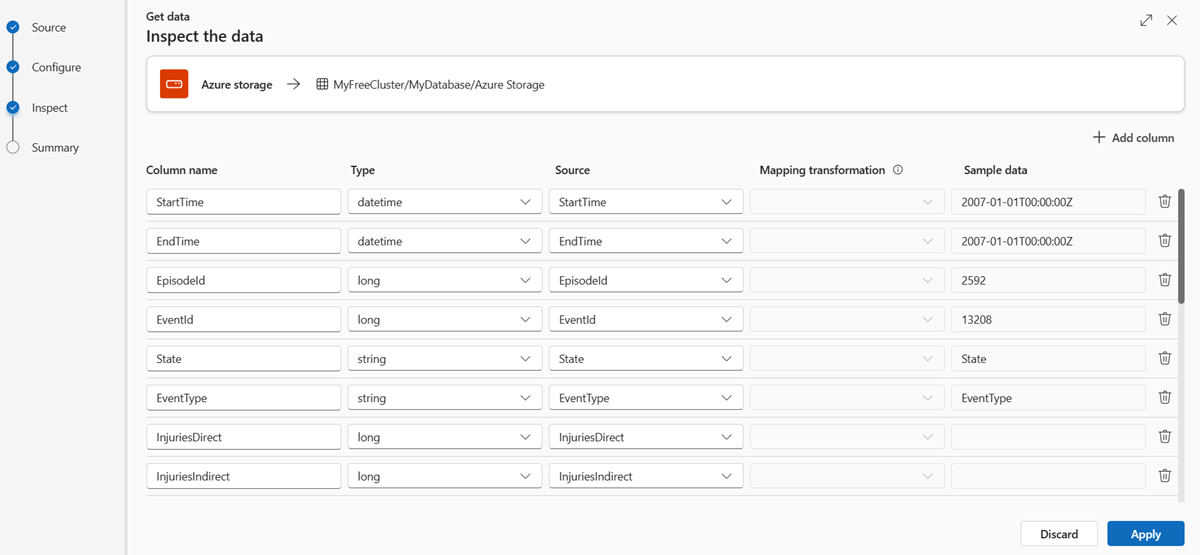 Some data format mappings (Parquet, JSON, and Avro) support simple ingest-time transformations. To apply mapping transformations, create or update a column in the Edit columns window.