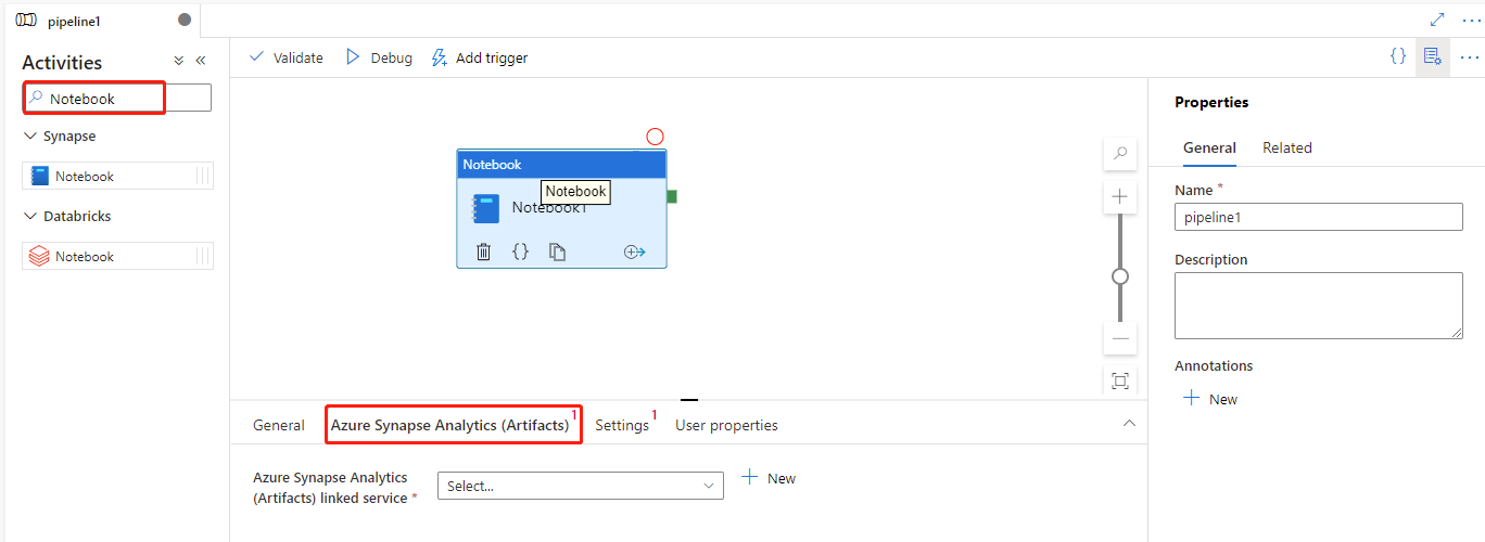 Select the Azure Synapse Analytics (Artifacts) tab to select or create a new Azure Synapse Analytics linked service that will execute the Notebook activity.