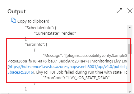 You can see the notebook activity input or output by selecting the input or Output button. If your pipeline failed with a user error, select the output to check the result field to see the detailed user error traceback.