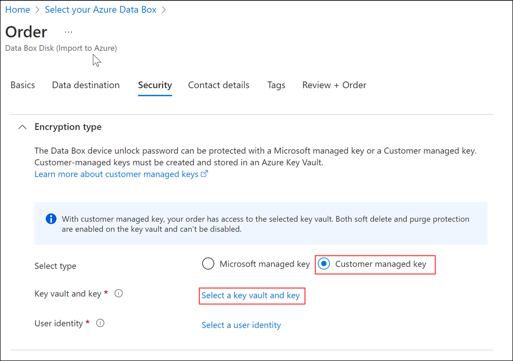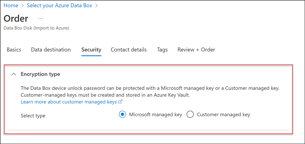 Configuring a customer-managed key for your Azure Data Box Disk is optional. By default, Data Box uses a Microsoft managed key to protect the unlock passkey.