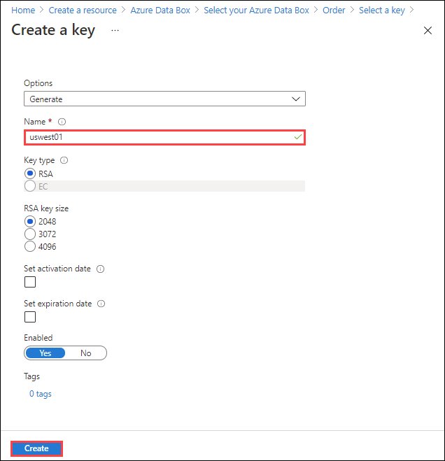 If you want to create a new key, select Create new key. You must use an RSA key. The size can be 2048 or greater. Enter a name for your new key, accept the other defaults, and select Create.