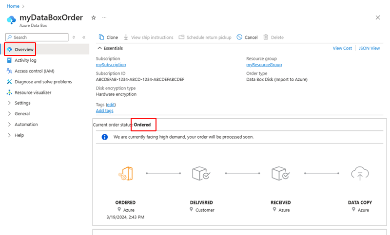 After you place the order, you can track the status of the order from Azure portal. Go to your order and then go to Overview to view the status. The portal shows the job in Ordered state.