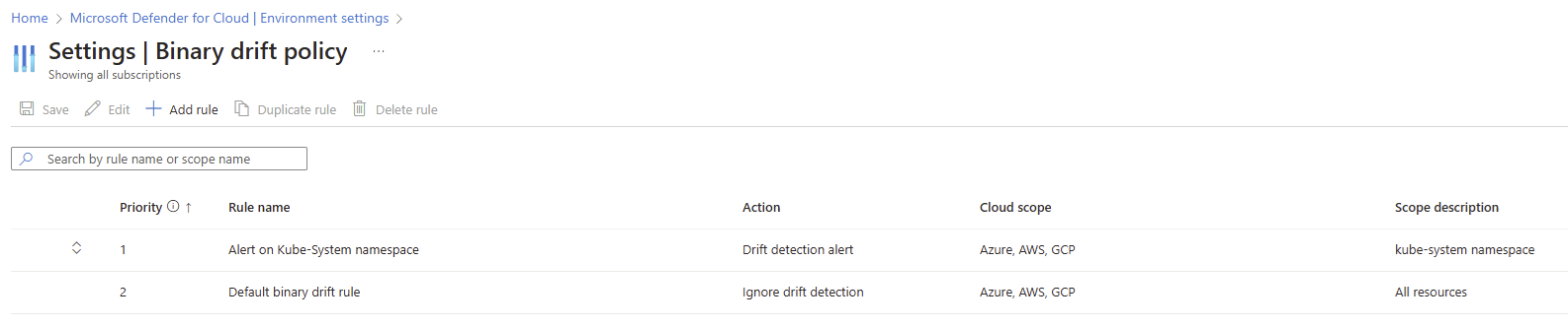 You receive two rules out of the box: the Alert on Kube-System namespace rule and the Default binary drift rule. The default rule is a special rule that applies to everything if no other rule before it's matched. You can only modify its action, either to Drift detection alert or return it to the default Ignore drift detection. The Alert on Kube-System namespace rule is an out-of-the-box suggestion and can be modified like any other rule.