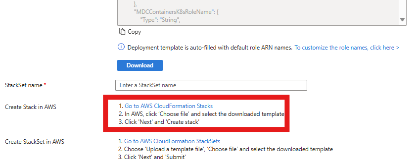 Follow the steps in the Connect AWS accounts to Microsoft Defender for Cloud until step 8 in the Connect your AWS Account section.