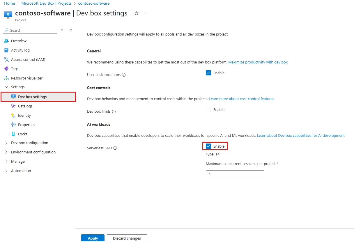 Access to serverless GPU resources is managed through project-level properties. When the serverless GPU feature is enabled for a project, all Dev Boxes in that project can use GPU compute. This simple access model removes the need for custom roles or pool-based configurations.