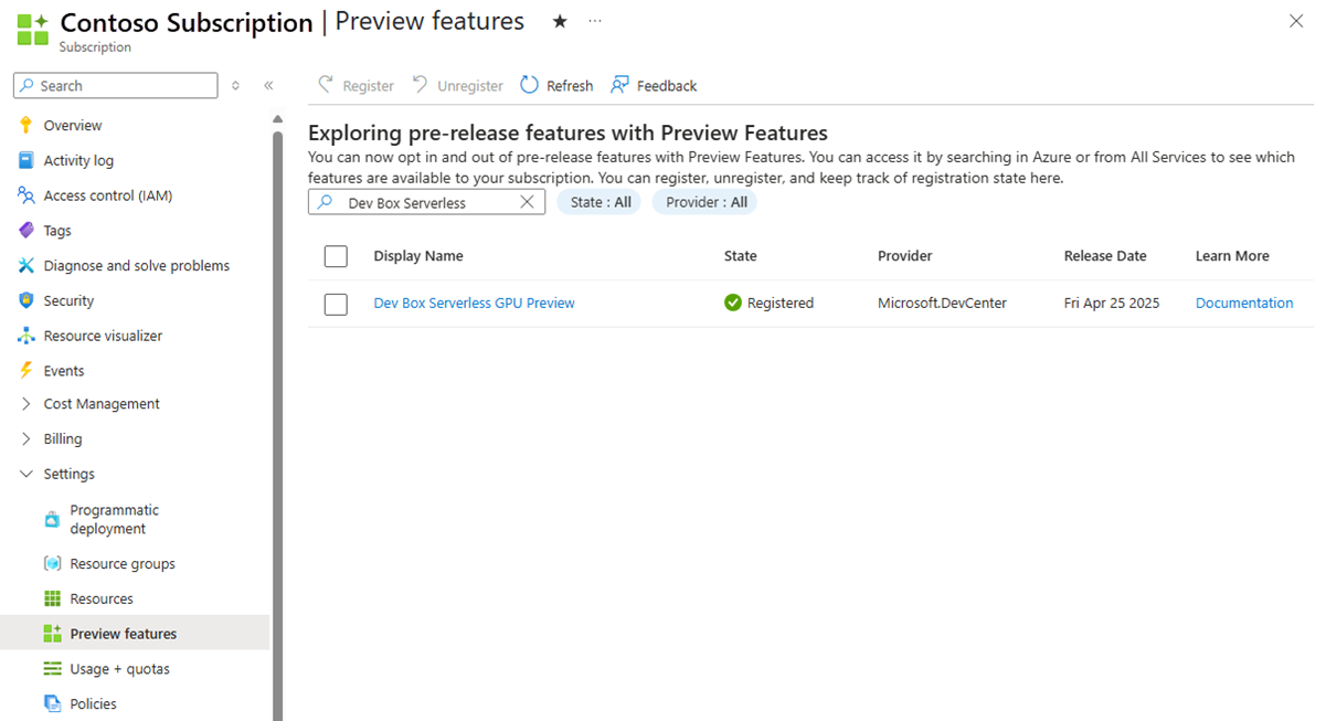- Select Dev Box Serverless GPU Preview, and then select Register.