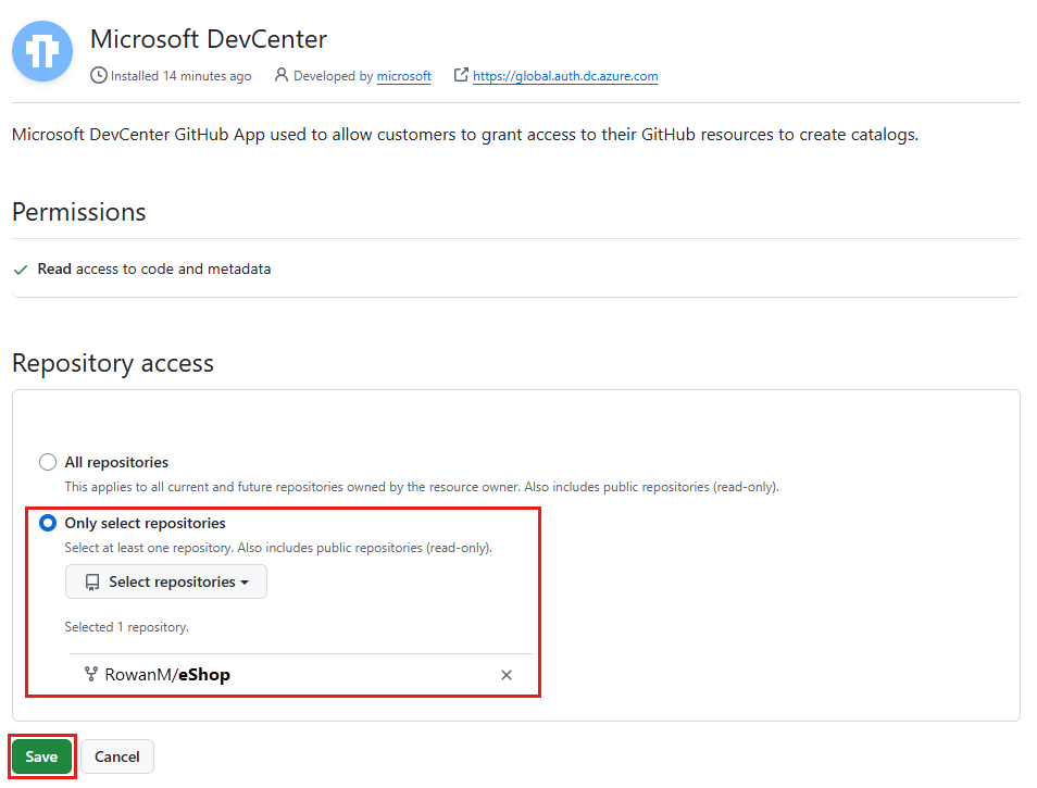 On the Install Microsoft DevCenter page, select Only select repositories, select the repository that you want to add as a catalog, and then select Save.