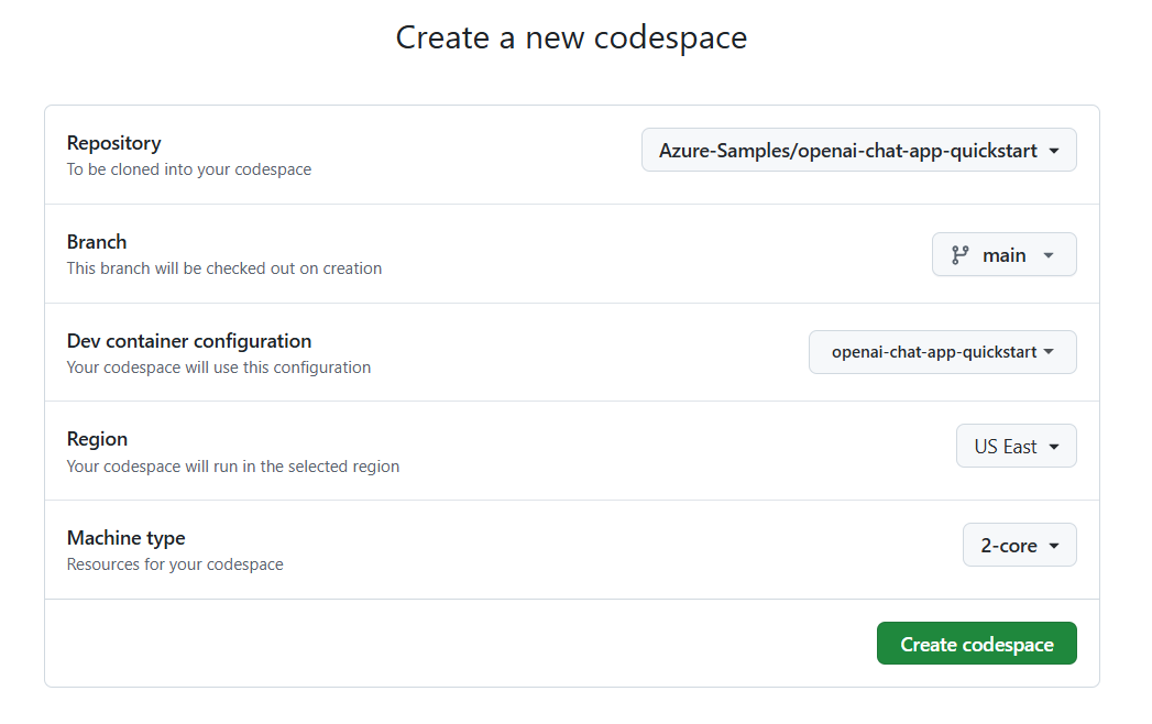 Use the following steps to create a new GitHub Codespace on the main branch of the Azure-Samples/openai-chat-app-quickstart GitHub repository.