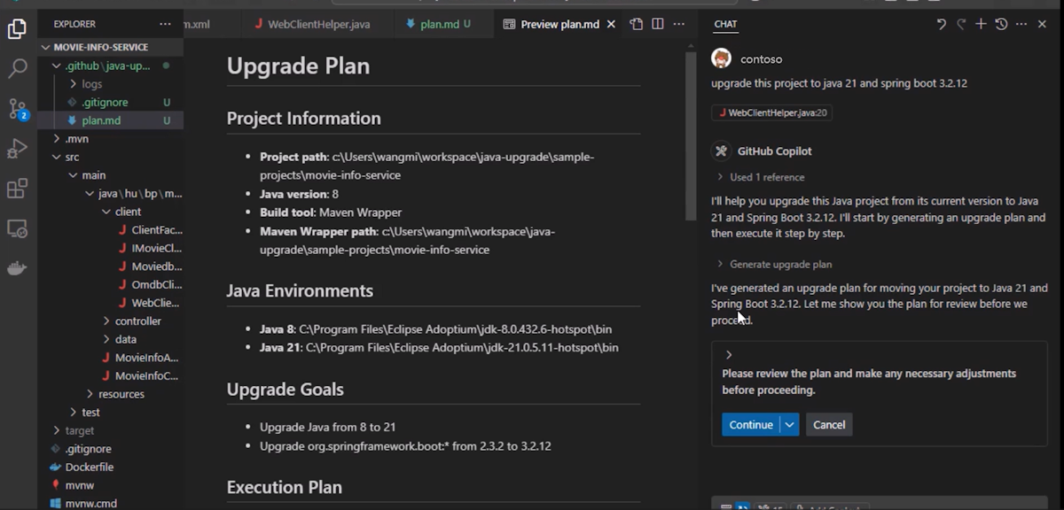 GitHub Copilot app modernization analyzes the Java project in the current workspace, including its JDK, build tools, and dependencies. The tool generates a plan.md file that outlines the following planned changes: